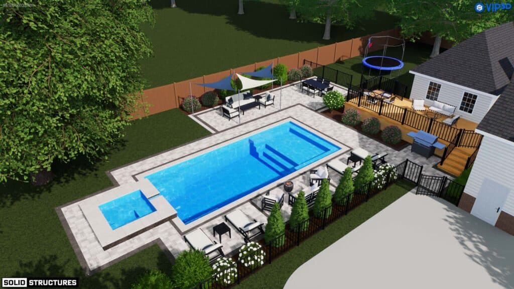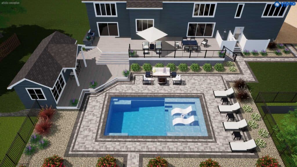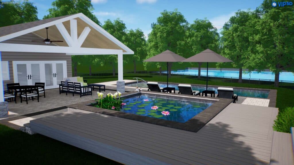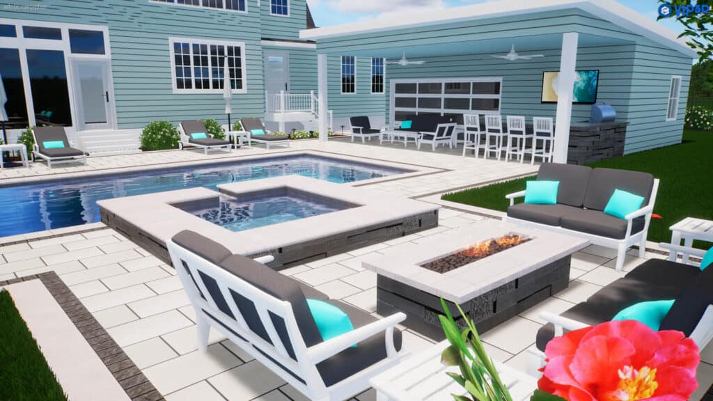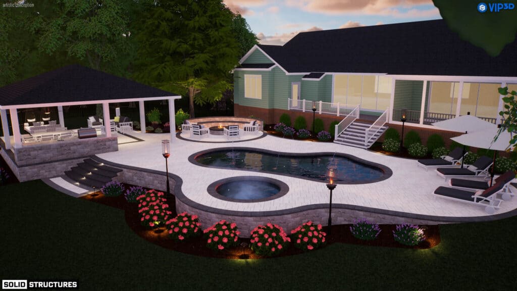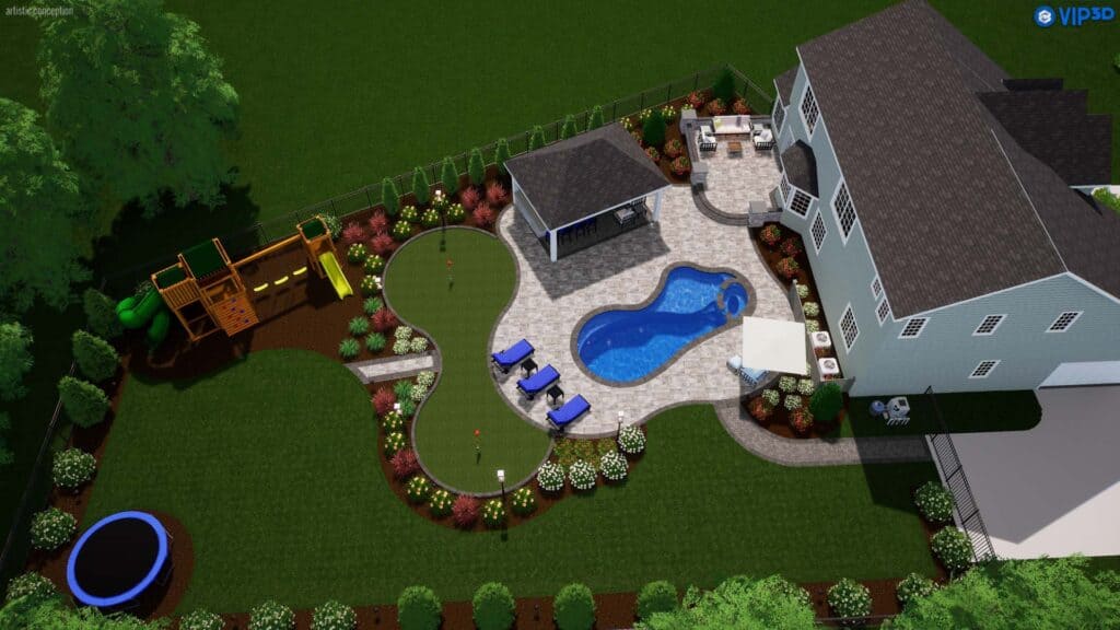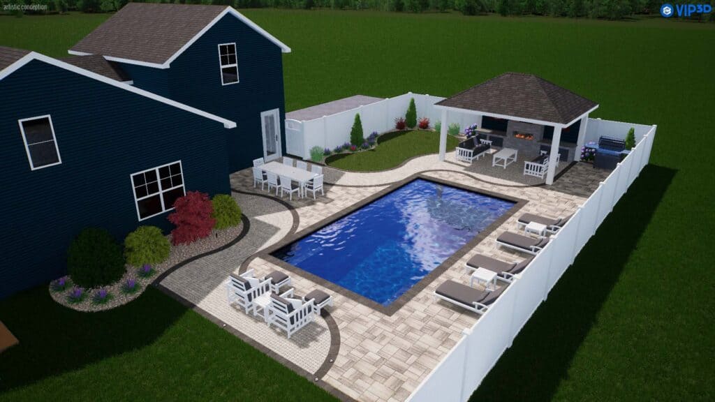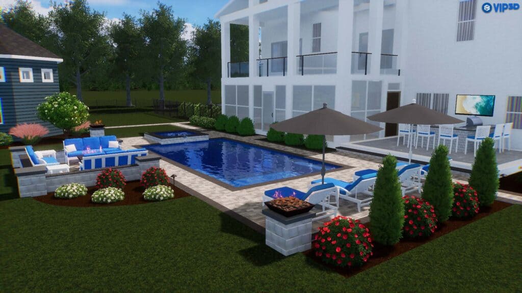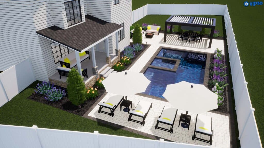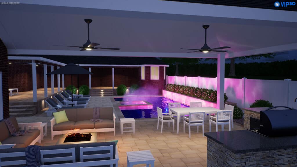 We use our specialized software to build two and three-dimensional renderings to bring the project to life. Special attention is used to add key components from the design questionnaire; a new pool, deck, pavers, outdoor kitchen, outdoor audio, landscape lighting, synthetic turf, fencing, fire features, and landscape design. The experience and education of our team produce high-quality designs that incorporate your wants and needs.